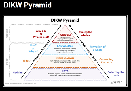 This relationship is often visualized as a pyramid. You cannot have Analysis without Information, but Information is useless without Analysis.